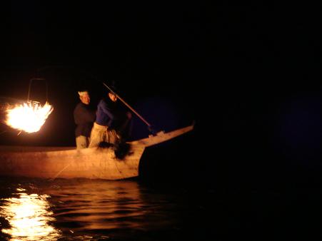 たいまつをともした船がすぐ横に並び、10羽ほどの鵜たちが忙しそうに